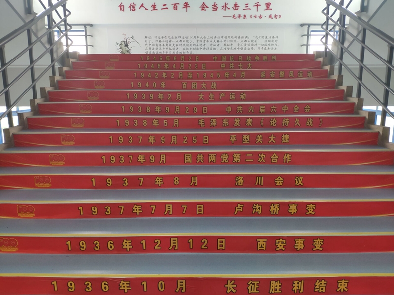 沿着台阶拾级而上,每一步都记载着一件举足轻重的大事,随着台阶的不断上升,老师同学们在学习党史的同时也体会到了百年大党的不易,对党的历程有了更加深刻的了解,使党史学习教育入脑入心,在潜移默化中不断增强全院师生的信念信仰。