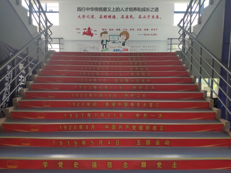 党史学习教育开展以来,信息工程学院党总支因地制宜积极探索党史学习教育方式方法,努力把党史学习教育融入日常,行于经常。近日,学院党总支积极创新举措,通过精心设计规划,在学院楼梯台阶立面以时间顺序,贴上了精美的党史知识条,引导师生学习、了解中国共产党筚路蓝缕奠基立业的百年历程,教育师生坚定爱党爱国信念。