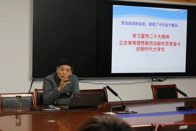 陈友放老师从二十大报告中对青年大学生的希望入手,通过对四个关键词的深入解读,引出“立志做有理想敢担当能吃苦肯奋斗的新时代大学生”的教育主题。陈友放教授通过对二十大报告内容的解读,结合党的发展历史,以及身边优秀学生、校友代表的例子,引导各位同学确立更清晰的方向,立志做有理想、敢担当、能吃苦、肯奋斗的新时代好青年。