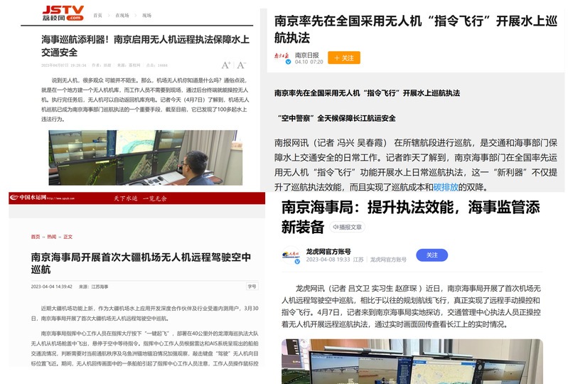 多家媒体对南京海事部门使用无人机开展水上巡航执法的报道