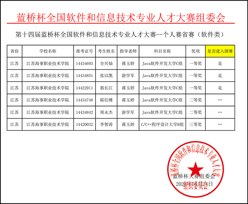 近日,第十四届“蓝桥杯”全国软件和信息技术专业人才大赛江苏省省赛成绩公布。本次比赛信息学院学子表现出色,其中荣获省赛一等奖3人、二等奖2人,三等奖1人。全兴灿、张以凯、郭长江三位同学成功入围全国总决赛,一等奖获得者人数再创新高。