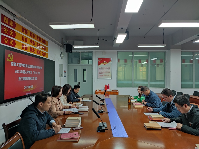 4月24日上午,信息工程学院党总支召开2023年理论学习中心组第二次学习(扩大)会,就学习贯彻习近平新时代中国特色社会主义思想主题教育相关内容展开专题学习。中心组全体成员、各党支部书记、组织员参加学习。会议由党总支书记刘永玲主持。