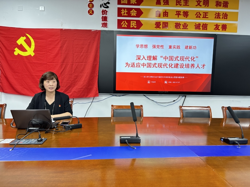 学思想,强党性。根据学校党委及学院主题教育实施方案安排,刘永玲以“深入理解 中国式现代化 为适应中国式现代化建设培养人才”为题为全体党员讲授主题教育专题党课。她首先用“一二三四五六”6个数字,带领大家重温了党的二十大报告中的重要论断,重点论述了中国式现代化的基本特征和本质要求。她指出,实现中国式现代化,落脚在高校就是要培养适应中国式现代化建设的人才,要明确适应中国式现代化建设人才培养需求,建设高水平的师资队伍。她号召全体党员教师通过主题教育,强党性、建新功,勇于担当,善于作为,干实事,求实效。