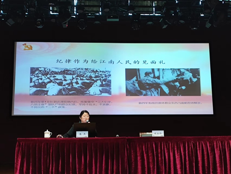 张燕从新四军铁军精神的渊源、内涵和时代意义三个方面进行深入阐述,为我们呈现了一幅铁军精神的历史画卷和时代风采。从1937到1947的十年烽火征程,新四军将士用鲜血和生命铸就的“听党指挥的铁的信念、报国为民的铁的担当、英勇顽强的铁的作风、执纪严明的铁的纪律”的铁军精神,是留给江苏人民最宝贵的精神财富。其中执纪严明的铁的纪律成为新四军铁军精神的最鲜明标识之一。