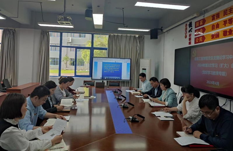 4月29日下午,信息工程学院党总支召开2024年理论学习中心组第三次学习(扩大)会,围绕党纪学习教育开展专题学习。中心组全体成员、内设机构负责人、党支部书记参加学习。会议由总支书记刘永玲主持。