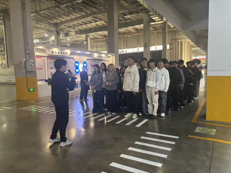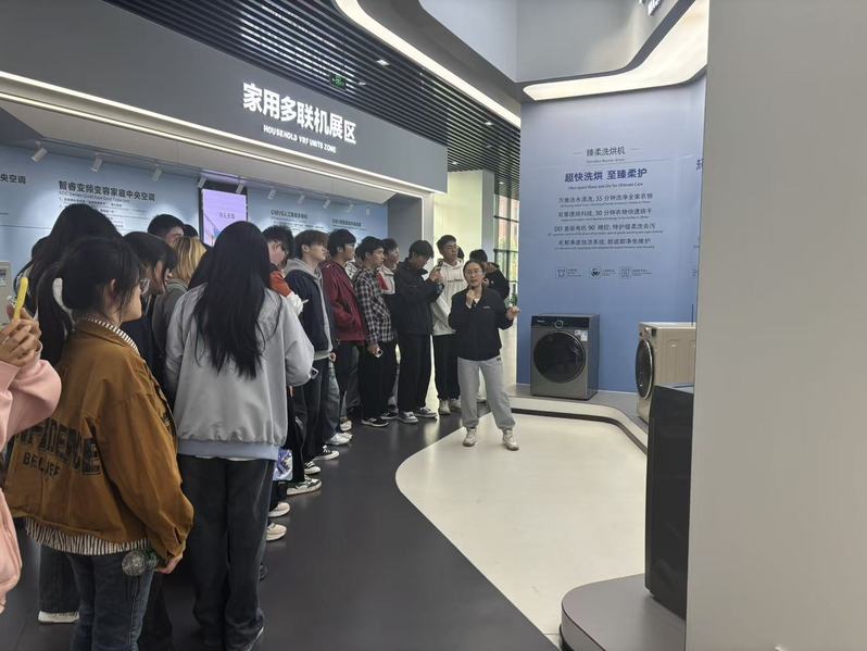 随后,在企业导览员的引领下,同学们依次参观了空调产品的自动化生产流水线。宏大的现代化厂区与“花园式”的工作环境令大家印象深刻。从精密的电路板贴装,到高效的整机组装,再到严格的成品检测,每一个环节都彰显出格力在工业自动化与智能制造领域的深厚积淀。机械臂精准运转、AGV小车灵活穿梭,曾经停留在书本上的“智能制造”概念,在这里化为真实可感的场景。同学们不仅对智能制造有了直观认识,更从这一系列先进工艺中感受到“中国制造”向“中国智造”跃升的坚实步伐,体会到令人振奋的中国力量。