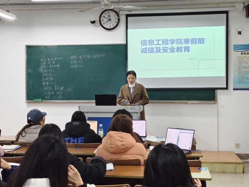 为进一步强化学生诚信意识,压实安全管理责任,确保全体学子度过一个平安、健康、充实的寒假,1月9日前,信息工程学院以“诚信立身,安全护航”为主题,组织全体在校学生开展寒假前诚信及安全教育系列活动。活动由辅导员牵头统筹,各班主任具体组织实施,通过主题班会、安全排查、线上宣讲等多种形式,实现教育全覆盖、无死角。