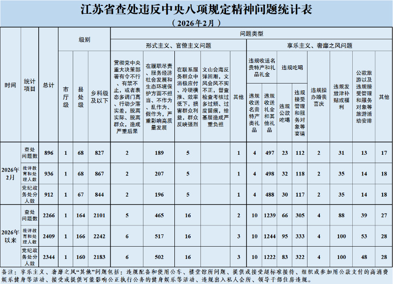 2026年2月,全省共查处违反中央八项规定精神问题896起,批评教育和处理936人、其中给予党纪政务处分912人。从问题类型看,查处形式主义、官僚主义问题197起、批评教育和处理215人,查处享乐主义、奢靡之风问题699起、批评教育和处理721人。从人员级别看,批评教育和处理市厅级干部1人、县处级干部68人、乡科级及以下人员867人。